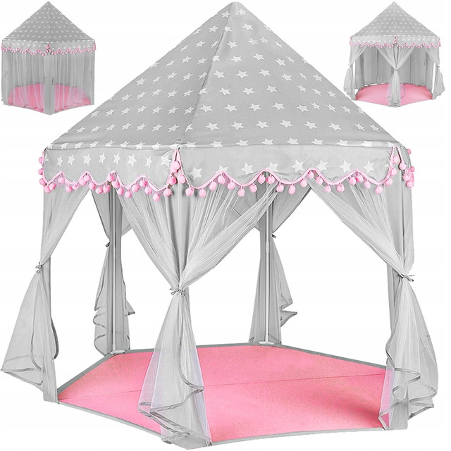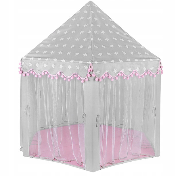 НОВАЯ, УЛУЧШЕННАЯ МОДЕЛЬ – мы создали совершенно новую, улучшенную модель палатки. Мы использовали сочетание розового и серого цветов со звездным мотивом. Дополнительно на рюшах есть красивые помпоны, которые делают ее еще более привлекательной. Палатка имеет 6 входных отверстий и коническую крышу. Все это выглядит фантастически и идеально впишется в любую комнату .