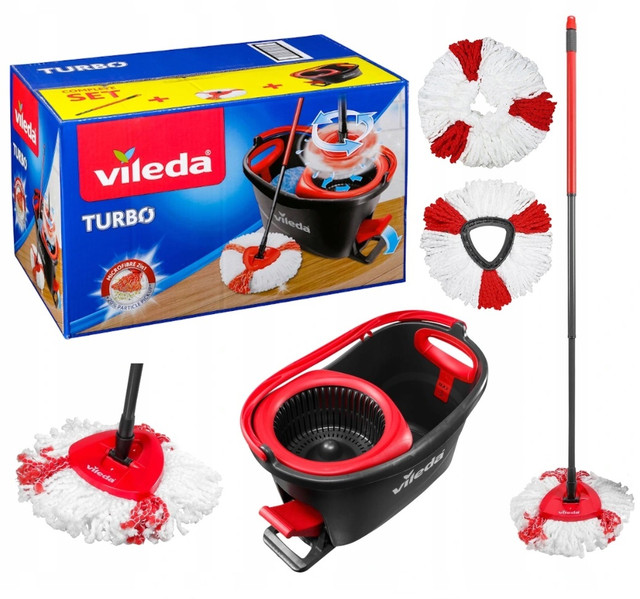 Набор Vileda Easy Wring and Clean Turbo упакован в картонную коробку следующих размеров: 48 см x 29,5 см x 29 см.
